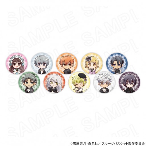 These colorful badges feature chibi versions of the characters in fancy attire.