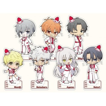 These stands feature the characters in chibi form with colorful strawberry outfits.